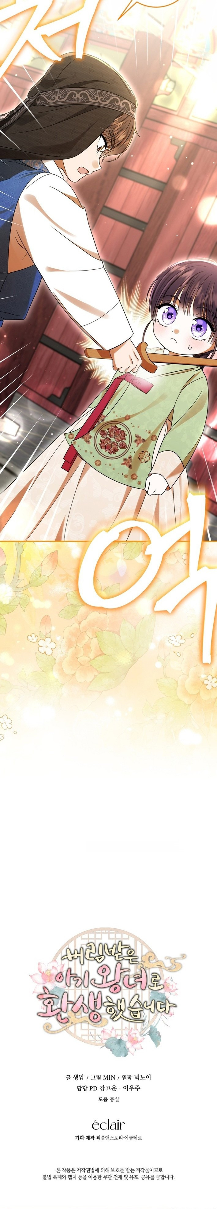 Una vez fui el asesino más letal de Corea del Sur... hasta que la persona en la que más confiaba me traicionó. «Sólo deseo una vida pacífica en mi próxima vida... sin asesinatos, sin traiciones». Pero el destino tenía otros planes. Cuando abrí los ojos, ya no era una asesina, había renacido como una princesa bebé en una novela de la era Joseon. Y lo que es peor, esta princesa fue abandonada al nacer, marcada para morir antes incluso de poder gatear. "Dicen que los infantes mueren fácilmente. No necesitaremos mover un dedo". En un palacio lleno de intrigas y puñales, debo luchar una vez más para sobrevivir. Esta vez, me niego a que me maten.